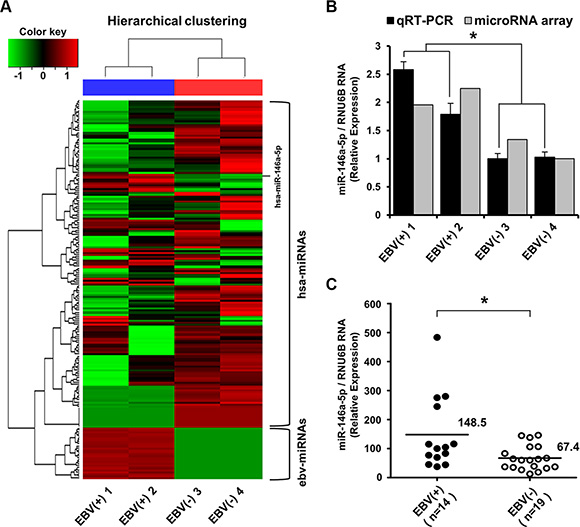 Figure 5: miRNA microarray expression profile and validation of miR-146a-5p level in surgically resected stomach cancer tissues. (A) Heat map and hierarchical clustering of miRNA expression showed a clear contrast between EBV-positive and EBV-negative cancer groups, with 31 miRNAs being upregulated including miR-146a-5p. Tissue samples are denoted as EBV(+) 1 and EBV(+) 2 for EBV-infected stomach cancer tissues and EBV(-) 3 and EBV(-) 4 for EBV-negative stomach cancer cases. The upper horizontal section represents human cellular miRNAs (hsa-miRNAs), and the lower horizontal section indicates EBV miRNAs (ebv-miRNAs). The red color indicates the expression of miRNAs in the sample, and green indicates absent or downregulated miRNAs. (B) TaqMan quantitative real-time RT-PCR was used to validate miRNA microarray data. miR-146a-5p levels were higher in EBV-positive stomach cancer tissues than in EBV-negative stomach cancer tissues (*P < 0.05). (C) TaqMan quantitative real-time RT-PCR for miR-146a-5p was performed for an additional 14 cases of EBV-positive stomach cancer tissues and the other additional 19 EBV-negative stomach cancer tissues. The miR-146a-5p level in the EBV-positive stomach cancer group was higher than that in the EBV-negative stomach cancer group (*P < 0.05). RNU6B was used to normalize miR-146a-5p expression.