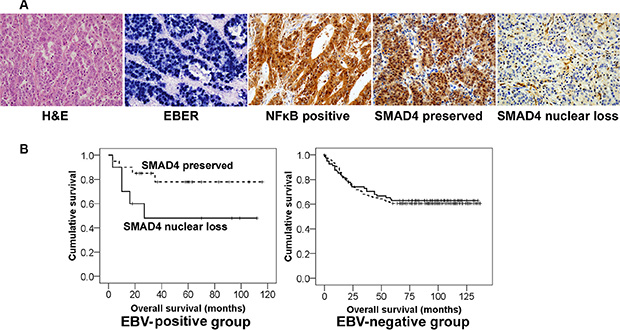 Figure 6: Different clinical implication of SMAD4 expression in EBV-positive and EBV-negative stomach cancer patients. (A) Representative microscopic images of the histologic features of EBV-positive stomach cancer tissues. In-situ hybridization for EBV-encoded small RNAs (EBER) showed black signals in almost all of the cancer cell nuclei. NFκB and SMAD4 immunohistochemistry was evaluated only nuclear staining of cancer cells. (B) Kaplan-Meier survival curves. The ‘SMAD4 loss’ group (solid line) tended to show a worse survival rate than the ‘SMAD4 preserved’ group (dotted line) among EBV-positive cancer patients (P = 0.08), whereas SMAD4 had no prognostic significance in EBV-negative patients.