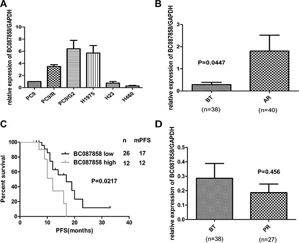 Figure 1: (A) The expression of BC087858 in lung cancer cells. Over-expression of BC087858 was observed in lung cancer cells with acquired resistance (H1975, PC9/R and PC9/G2 cells) but not found in primary resistant cells (H23, H460) compared to sensitive cell line(PC9). (B) BC087858 expression levels in lung cancer tissues assessed by qRT-PCR in patients with EGFR-TKI-sensitive NSCLC (BT group) and patients who developed acquired resistance to EGFR-TKIs(AR group). (C) Progression-free survival (PFS) in patients with high and low BC087858 expression levels before EGFR-TKI treatment. (D) BC087858 expression levels were assessed in patients before EGFR-TKIs treatment and primary resistance subgroup. BT: before treatment; AR: acquired resistance; PR: primary resistance; PFS: progression-free survival.