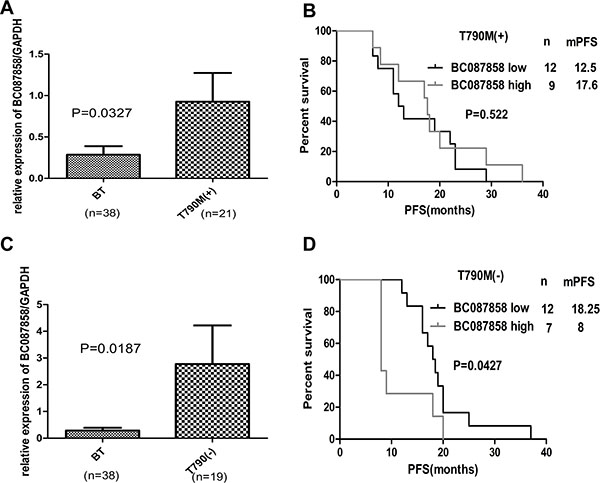 Figure 2: (A–C) expression levels of BC087858 assessed in patients treated with EGFR-TKI-sensitive NSCLC (BT group) and patients who were with and without T790M mutations. (B–D) PFS in patients with acquired resistant who were with T790M mutations and without T790M mutations.