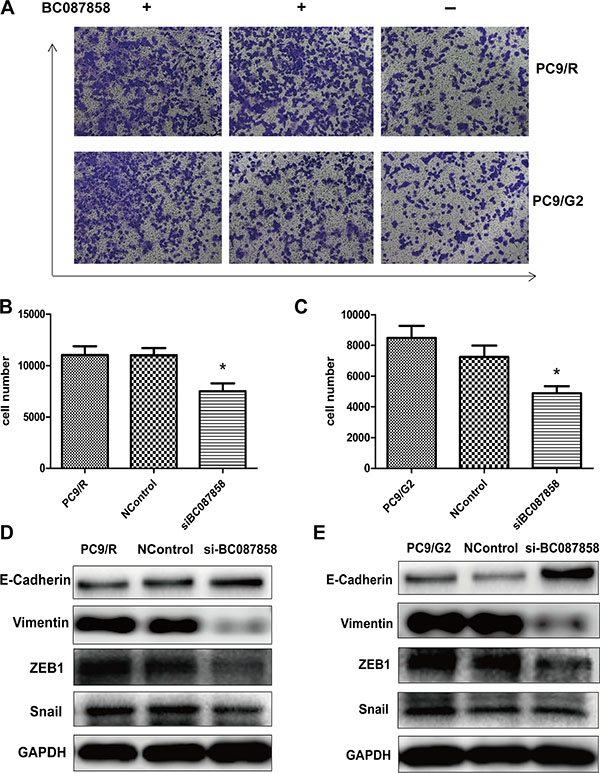 Figure 4: (A) The in vitro cell invasion of PC9/R and PC9/G2 cell after silencing of BC087858 by si-RNA. (B–C) 5 migration cell number were counted 5 visions per well. (D–E) E-cadherin, Vimentin, Snail and ZEB1(co-mediator of EMT). EMT: epithelial-mesenchymal transition.
