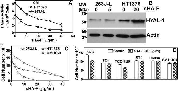 Figure 1: Effect of sHA-F on HAase activity and cell proliferation. A. Effect of sHA-F on HAase activity (mU/106 cells) in a HAase ELISA like assay (duplicate measurement for each concentration). B. Immunoblot analysis of serum-free conditioned media of 253J-L and HT1376 cells collected after 48-hour treatment with sHA-F. C and D. BCa cells were treated with sHA-F for 72 hours and viable cells were counted. Data: Mean ± sd (quadruplicate). Figure C, the differences in cell numbers between untreated control and sHA-F treated samples were significant (P ≤ 0.002 at each sHA-F concentration). Figure D: Control versus sHA-F treatment; P > 0.05 for each cell line.