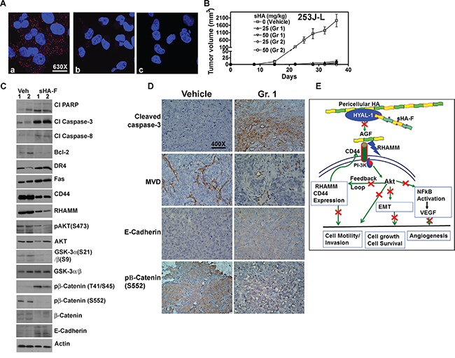 Figure 7: Effect of sHA-F HA signaling and BCa xenograft. A. PLA for PI-3K and CD44 in 253J-L cells treated with sHA-F (0, 5-μg/ml). Confocal microscopy images at 630X magnification are shown. a and b: cells treated with 0 (a) and 5-μg/ml sHA-F (b); c: IgG control. Note the CD44 and PI-3K complex (red dots) present in untreated cells is significantly reduced in sHA-F treated cells. B. Athymic mice were implanted subcutaneously with 253J-L cells and treated with vehicle or sHA-F (25 mg/kg or 50 mg/kg. Group 1: Treatment started on the day of tumor cell injection and continued for two weeks. Group 2: Treatment started on day 9, when tumors became palpable and continued until day 24. C. Immunoblot analysis of tumor tissues for apoptosis effectors and HA signaling molecules. β-actin: loading control. D. Immunohistochemical analysis. Tumor tissues from the vehicle and sHA-F treatment (Group 1) groups were subjected to activated caspase-3, CD34, E-cadherin and pβ-Catenin(S552) staining using immunohistochemistry as described in the Supplemental information. Magnification: 400X. E. Proposed model for the mechanism of action for sHA-F.