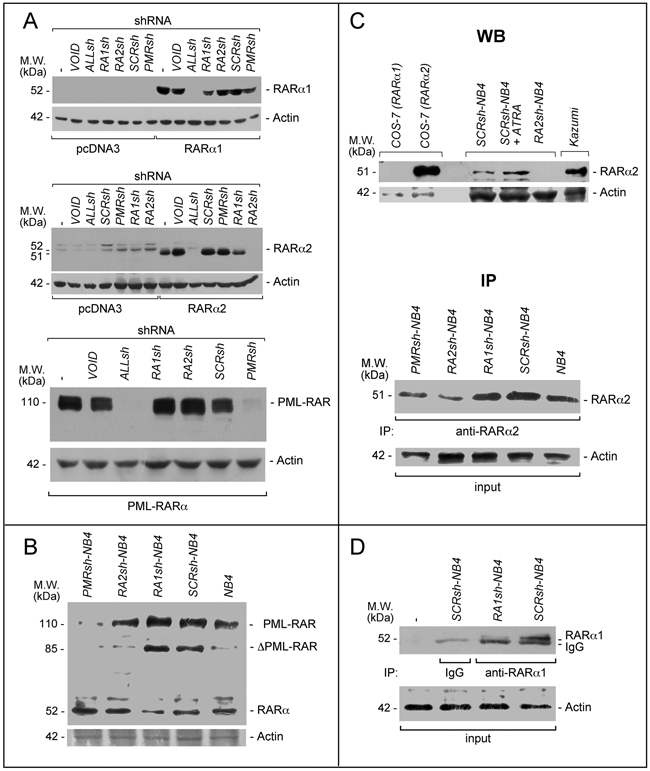 Figure 2: PML-RAR, RARα2 and RARα1 knock-down in COS-7 and NB4 cells. A. COS-7 cells were transiently transfected with the pcDNA3, pcDNA3-RARα2, pcDNA3-RARα1 and pSG5-PML-RAR plasmids in the presence of the indicated shRNA-containing retroviral vectors and corresponding void vector (VOID). Sixteen hours following transfection, cell extracts were subjected to Western blot analysis using an anti-RARα antibody [RP alpha (F)]. Actin is used as a loading control. ALLsh = shRNA targeting RARα1 (RARα.v1 and RARα.v3 mRNAs), RARα2 (RARα.v2 mRNA) and RARα4 (RARα.v4 mRNA); RA1sh = shRNA targeting RARα1; RA2sh = shRNA targeting RARα2; PMRsh = shRNA targeting PML-RAR; SCRsh = scramble shRNA (negative control). The (-) symbol represents extracts from COS-7 cell transfected in the absence of any shRNA. B. The indicated NB4 cell populations stably infected with shRNAs targeting PML-RAR (PMRsh-NB4), RARα1 (RA1sh-NB4), RARα2 (RA2sh-NB4) or scramble shRNA (SCRsh-NB4) as well parental NB4 cells (NB4) were grown under standard conditions for 48 hours. Cell extracts were subjected to Western blot analysis using the same anti-RARα antibody as in (A). Actin is used as a loading control. C. Upper (WB = Western Blots): Extracts from the indicated COS-7 cells transfected with RARα1 and RARα2 expressing plasmids as well as the indicated NB4 cells [see (B)], were subjected to Western blot analysis with anti-RARα2 [Ab25alpha2(A2)] and β-actin (loading control) antibodies. SCRsh-NB4 = cell treated with vehicle (DMSO) for 24 hours; SCRsh-NB4+ATRA = cell treated with ATRA (1 μM) for 24 hours. Kazumi cells extracts are used as a control for RARα2 expression, as they contain high levels of the protein. Lower (IP = immunoprecipitations): Extracts from the indicated NB4 cell populations and parental NB4 cells [see (B)], were immuno-precipitated with an anti-RARα2 antibody [Ab25alpha2(A2)] coupled to Protein G sepharose beads. The immuno-precipitates were subjected to Western blot analysis with a different anti-RARα antibody [RP alpha (F)]. Equivalent amounts of protein extracts were used to immuno-precipitate RARα2, as indicated by the levels of actin in the extracts before addition of the anti-RARα2 antibody (input). D. Extracts from the indicated NB4 cell populations [see (B)] were immuno-precipitated with an anti-RARα1 antibody [Ab10alpha1(A1)] or mouse immunoglobulin G (IgG) coupled to Protein G Sepharose beads or Protein G Sepharose beads alone (-). The immuno-precipitates were subjected to Western blot analysis with a different anti-RARα antibody [RP alpha (F)]. The actin loading control of the immuno-precipitation experiment is shown (input). The calculated molecular weight (M.W.) of each protein is indicated on the left of each blot.