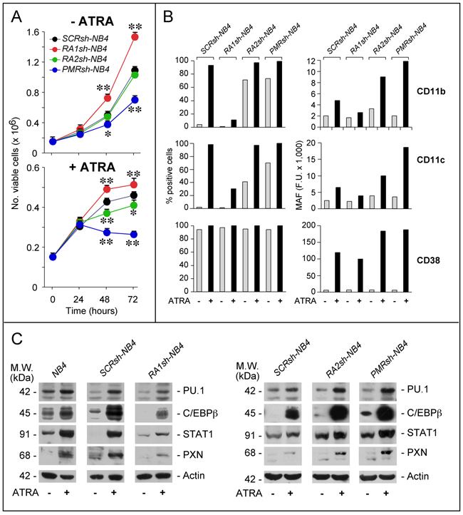 Figure 3: Effects of PML-RAR, RARα2 and RARα1 knock-down on the growth and differentiation of NB4 cells. A. The indicated NB4 cell populations stably infected with shRNAs targeting PML-RAR (PMRsh-NB4), RARα1 (RA1sh-NB4), RARα2 (RA2sh-NB4) or the control scramble shRNA (SCRsh-NB4) were grown in the presence of vehicle (DMSO) or ATRA (1 μM) for the indicated amount of time. The number of viable cells determined after staining with trypan blue is indicated. Each point is the mean±S.D. of three replicate cultures. ** = Significantly different relative to the corresponding SCRsh-NB4 time point (p<0.01 after Student’s t-test); * = Significantly different relative to the corresponding SCRsh-NB4 time point (p<0.05 after Student’s t-test). B. The indicated NB4 cell populations [see (A)] were grown in the presence of vehicle (DMSO) or ATRA (1 μM) for 72 hours. Cells were subjected to FACS analysis for the indicated markers. The column graphs on the left indicate the percentage of CD11b-, CD11c- and CD38-positive cells. The graphs on the right indicate the MAF (mean-associated-fluorescence) values determined. The results are representative of two independent experiments. C. The indicated NB4 cell populations were treated as in (B) for 48 hours. Cell extracts were subjected to Western blot analysis for the indicated proteins. Actin is used as a loading control. The results shown in the upper and lower panels were obtained in separate experiments. Each line shows cropped lanes of the same gel, hence the results can be compared across the lanes, as they were obtained with the same exposure time. The calculated molecular weight (M.W.) of each protein is indicated on the left. The results are representative of at least two independent experiments.