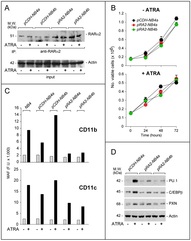 Figure 4: Effects of RARα2 over-expression on the growth and differentiation of NB4 cells. NB4 cells were transfected with the pCDH-RA2 plasmid and the corresponding void vector, pCDH. Two distinct RARα2 expressing (pRA2-NB4a and pRA2-NB4b) and two (pCDH-NB4a and pCDH-NB4b) cell populations were isolated. A. Cells were treated with ATRA (1 μM) for 24 hours. Cell extracts were immuno-precipitated with an anti-RARα2 antibody [Ab25alpha2(A2)] coupled to Protein G sepharose beads. The immuno-precipitates were subjected to Western blot analysis with a different anti-RARα antibody [RP alpha (F)]. Equivalent amounts of protein extracts were used to immuno-precipitate RARα2, as indicated by the levels of actin present in the extracts before addition of the anti-RARα2 antibody (input). B. Cells were treated with vehicle (DMSO) or ATRA (1 μM) for the indicated amount of time. The number of viable cells determined after staining with trypan blue is indicated. Each point is the mean±S.D. of three replicate cultures. C. Cells were grown in the presence of vehicle (DMSO) or ATRA (1 μM) for 72 hours and subjected to FACS analysis for the determination of CD11b and CD11c. The column graphs indicate the MAF (mean-associated-fluorescence) values determined. D. Cells were grown as in (C) and treated with vehicle (DMSO) or ATRA (1 μM) for 48 hours. Cell extracts were subjected to Western blot analysis for the indicated proteins. Actin is used as a loading control. The calculated molecular weight (M.W.) of each protein is indicated on the left.