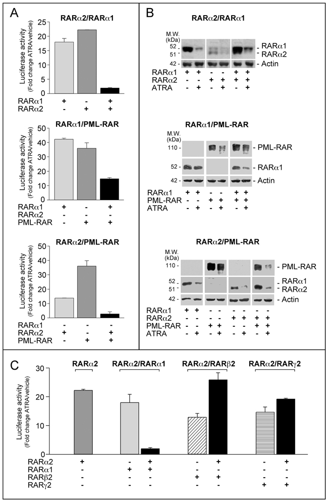 Figure 7: Interference between RARα2 and RARα1 or PML-RAR transcriptional activity. A. COS-7 cells were transfected with pcDNA3-RARα2, pcDNA3-RARα1 and pSG5-PML-RAR plasmids alone or in combination and β2RARE-Luc. Sixteen hours following transfection, cells were treated with DMSO or ATRA (1 μM) for 24 hours. B. COS-7 cell extracts were subjected to Western blot analysis with an anti-RARα antibody [RP alpha (F)]. The same amounts of extracts used for the determination of RARα1 and RARα2 were subjected to Western blot analysis to determine the loading control, β-actin. C. COS-7 cells were transfected with pcDNA3-RARα2, pcDNA3-RARα1, pSG5-RARβ2 and pSG5-RARg2 plasmids alone or in combination and β2RARE-Luc. Sixteen hours following transfection, cells were treated with DMSO or ATRA (1 μM) for a further 24 hours. Luciferase activity is expressed as the ratio of ATRA/DMSO luciferase activity (fold-change). Each value is the mean±SD of two replicates.