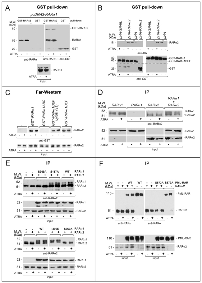 Far-Western experiments were performed (Figure 8C) on extracts of COS-7 cells transfected with hemoagglutinin(HA)-tagged RARα2 and treated with vehicle or ATRA. Immobilized HA-RARα2 immuno-precipitates (anti-HA antibodies) were challenged with GST-RARα1. Following incubation with GST-RARα1, but not GST, an anti-GST antibody highlights a band at the height of HA-RARα2. This demonstrates a direct interaction between HA-RARα2 and GST-RARα1, which is reproduced with the 2 GST-RARα1 derivatives consisting of the DEF regions containing (GST-RARα1DEF) or lacking the H12 helix [GST-RARα1DEFD(408-416)]. The GST-RARα1 protein consisting of the ABC regions (GST-RARα1ABC) does not interact with HA-RARα2. No quantitative difference in the RARα2/RARα1 interaction is observed in the absence/presence of ATRA.