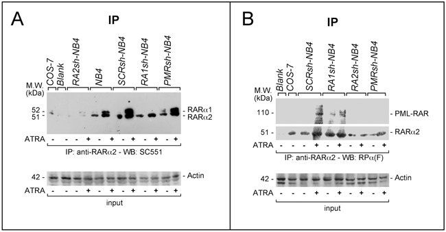 Figure 9: Physical interactions between RARα2 and RARα1 or PML-RAR in NB4 cells. A. and B. Immuno-precipitation (IP) experiments: SCRsh-NB4, RA1sh-NB4, PMRsh-NB4, RA2sh-NB4 and NB4 parental cells were treated with vehicle or ATRA (1 μM) for 4 hours. Cell extracts were immuno-precipitated using an anti-RARα2 antibody [Ab25alpha2(A2)]. This was followed by Western blot analysis of the immunoprecipitates with two distinct antibodies, which, in our experimental conditions, detect RARα2 and RARα1 (SC551) (A) or RARα2, RARα1 and PML-RAR [RP alpha (F)] (B), respectively. Input: cell extracts (10 μg of protein) representing 10% of the total amount of protein used for the immune-precipitations were subjected to Western blot analysis with an anti-actin antibody.