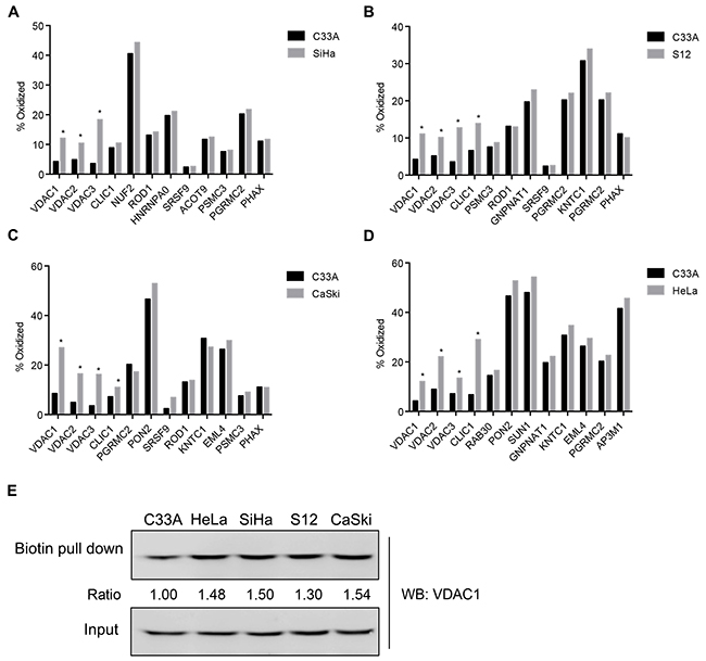 Figure 1: OxICAT screened out VDAC1, VDAC2 and VDAC3 in HPV-related cervical cancer cells. Five cervical cancer cell lines, SiHa (HPV16-positive), S12 (HPV16-positive), CaSki (HPV16/18-positive), HeLa (HPV18-positive) and C33A (HPV-negative) were used to estimate the global status of proteins by OxICAT. A. The oxidation states of proteins in SiHa and C33A cell lines. B. The oxidation states of proteins in S12 and C33A cell lines. C. The oxidation states of proteins in CaSki and C33A cell lines. D. The oxidation states of proteins in HeLa and C33A cell lines. E. Validation of VDAC1 proteomic results by BIAM assays. All data are presented as the mean ± SD of three independent experiments, *P < 0.05.