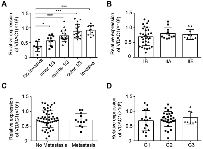 Figure 2: VDAC1 expression correlated with the invasive depths of cervical cancer tissues. The expression of VDAC1 in cervical cancer specimens was detected by IHC staining, and the relationships between the levels of VDAC1 and clinicopathologic features were estimated. A. The relative expression of VDAC1 in cervical cancer tissues with different invasive depths. *, P < 0.05, ***, P < 0.001. B. The relative expression of VDAC1 in cervical cancer tissues according to FIGO staging. C. The relative expression of VDAC1 in cervical cancer tissues with or without metastasis. D. The relative expression of VDAC1 in cervical cancer tissues according to differentiation status: G1, well-differentiated; G2, moderately differentiated; G3, poorly differentiated. The data are presented as the mean ± SD with scatter plots representing the individual detailed protein levels.
