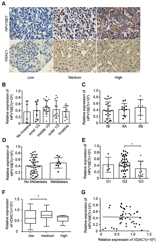 Figure 3: HPV16 E7 expression was not related to clinicopathologic features or VDAC1 expression in cervical cancer. The expression of HPV16 E7 in cervical cancer specimens was detected by IHC staining, and the relationships between the expression of HPV16 E7 and clinicopathologic features were estimated, along with the relationship between VDAC1 and HPV16 E7 expression in cervical cancer specimens. A. Representative figures of VDAC1 and HPV16 E7 expression are displayed in a row, with the figures on the left representing low expression, figures in the middle representing light positive expression, and figures on the right representing positive expression (magnification 400X). B. The relative expression of HPV16 E7 in cervical cancer tissues with different invasive depths. C. The relative expression of HPV16 E7 in cervical cancer tissues according to FIGO staging. D. The relative expression of HPV16 E7 in cervical cancer tissues with or without metastasis. E. The relative expression of HPV16 E7 in cervical cancer tissues according to differentiation status: G1, well-differentiated; G2, moderately differentiated; G3, poorly differentiated. F. The relative expression of VDAC1 in cervical cancer tissues grouped according to HPV16 E7 expression. *, P< 0.05. G. The linear relationship between VDAC1 and HPV16 E7 expression. P > 0.05. The data are presented as the mean ± SD with scatter plots representing the individual detailed protein levels.