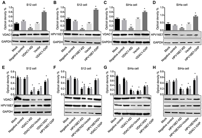 Figure 5: VDAC1 and HPV16 E7 protein levels were impacted in S12 and SiHa cell lines transfected with the corresponding CRISPR-VDAC1 or CRISPR-HPV16 E7 and overexpression plasmids. Western blots are shown for A. VDAC1 protein expression in S12 cells transfected with CRISPR-VDAC1 and an ectopic VDAC1 plasmid. B. HPV16 E7 expression in S12 cells transfected with CRISPR-HPV16 E7 and an ectopic HPV16 E7 plasmid. C. VDAC1 expression in SiHa cells transfected with CRISPR-VDAC1 and an ectopic VDAC1 plasmid and D. HPV16 E7 expression in SiHa cells transfected with CRISPR-HPV16 E7 and an ectopic HPV16 E7 plasmid. Western blots are shown for E. VDAC1 and HPV16 E7 expression in S12 cells co-transfected with CRISPR-VDAC1 and an ectopic HPV16 E7 plasmid. F. VDAC1 and HPV16 E7 expression in S12 cells co-transfected with CRISPR-HPV16 E7 and an ectopic VDAC1 plasmid. G. VDAC1 and HPV16 E7 expression in SiHa cells co-transfected with CRISPR-VDAC1 and an ectopic HPV16 E7 plasmid and H. VDAC1 and HPV16 E7 expression in SiHa cells co-transfected with CRISPR-HPV 16 E7 and an ectopic VDAC1 plasmid. For all panels, quantitative measurements are shown above the Western blots. The expression of GAPDH was used for normalization. All data are presented as the mean ± SD of three independent experiments, * P < 0.05.