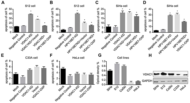 Figure 6: Reduced VDAC1 / HPV16 E7 expression induced apoptosis in cervical cancer cells transfected with CRISPR-VDAC1 or CRISPR-HPV16 E7, while overexpression of the HPV16 E7 / VDAC1 partly reversed these effects. S12 and SiHa cell lines were transfected for 48 hours with the indicated CRISPR-VDAC1 / CRISPR-HPV16 E7 and corresponding overexpression plasmids. A. Apoptosis of the S12 cell line after co-transfection with CRISPR-VDAC1 and the HPV16 E7 plasmid. B. Apoptosis of the S12 cell line after co-transfection with CRISPR- HPV16 E7 and the VDAC1 plasmid. C. Apoptosis of the SiHa cell line after co-transfection with CRISPR-VDAC1 and the HPV16 E7 plasmid. D. Apoptosis of the SiHa cell line after co-transfection with CRISPR- HPV16 E7 and the VDAC1 plasmid. E. Apoptosis of the C33A cell line after co-transfection with CRISPR-VDAC1 and the VDAC1 plasmid. F. Apoptosis of the HeLa cell line after co-transfection with CRISPR-VDAC1 and the VDAC1 plasmid. G. The quantitative measurement of VDAC1 expression in cell lines is shown. (H) VDAC1 expression in cell lines were detected by Western blotting. The expression of GAPDH was used for normalization. All data are presented as the mean ± SD of three independent experiments, * P < 0.05.