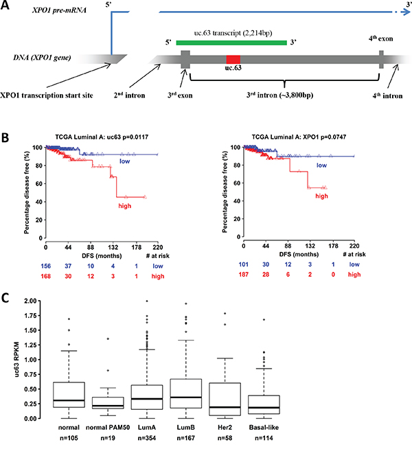 We downloaded RNA-seq BAM files from UCSC Cancer Genomics Hub (CGHub, https://cghub.ucsc.edu/) for Breast invasive carcinoma (BRCA), respectively normal cases from TCGA (The Cancer Genome Atlas). TCGA BAM files were generated based on Mapsplice2 algorithm for alignment against the hg19 reference genome using default parameters. We quantified the expression of uc.63 as RPKM (reads per kilobase per million mapped reads) by extracting the number of reads overlapped with uc.63 and normalized by the total mappable reads of each sample as previously described [86]. We downloaded RNASeq (RPKM) Level3 data publicly available from the TCGA (http://tcga-data.nci.nih.gov/) for XPO1 in patients with BRCA. Patient survival information was retrieved from cbioPortal (http://www.cbioportal.org/). Patient PAM50 classification results were retrieved from the Associated Data Files of the Cancer Genome Atlas Research Network [87]. Data are available per request. Analyses were carried out in R statistical environment (version 3.0.1) (http:///www.r-project.org/). All tests were two-sided and considered statistical significant at the 0.05 level. We performed Cox regression analysis for associations between survival and uc.63 and XPO1 levels. For the Lumina A subgroup, the disease-free survival analysis yielded for uc.63 a hazard ratio of 3.49 (CI(95%)=(1. 17, 10.34), Wald test p-value =0.0243). We than used the log-rank test to find the point (cut-off) with the most significant (lowest p-value) split in high vs low uc.63 mRNA level groups. The Kaplan-Meier plots were generated for this cut-off (0.48). The numbers of patients at risk in low and high uc.63 groups at different time points are presented at the bottom of the graph. The same analysis revealed that XPO1 expression does not associate with survival in this group (hazard ratio= 1.58, CI(95%)=(0.45, 5.9), Wald test p-value = 0.475). We used same methods as for uc63 to generate Kaplan-Meier plots for XPO1 (cut-off=0.35). The Shapiro-Wilk test was applied and verified that uc.63 expression does not follow a normal distribution in each PAM50 subtype, and normal group. Accordingly, the nonparametric Kruskal-Wallis test was applied to assess the relationship between uc.63 expression and subtype. A box-and-whisker plot (Box plot represents first (lower bound) and third (upper bound) quartiles, whiskers represent 1.5 times the interquartile range) was used to visualize the data (log2(x+1)).
