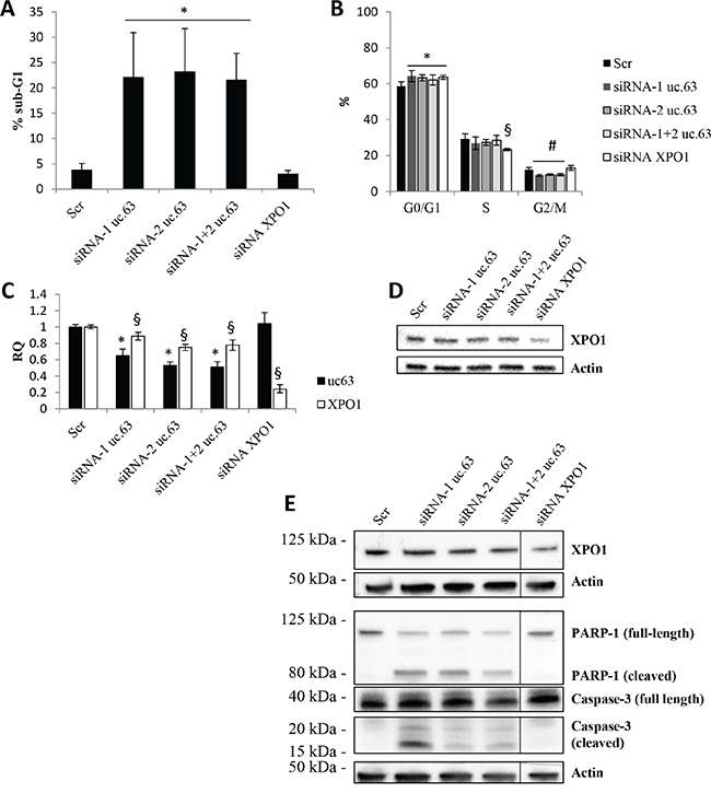 Figure 3: uc.63 knockdown induces apoptosis in MDA MB 453 cell line. A. sub-G1 events were quantified by using flow cytometry analysis after propidium iodide staining of MDA MB 453 cell line. 500,000 cells were plated and then silenced with siRNA (20nM) targeting uc.63 or XPO1 for 48h. *p < 0.01 vs Scr. B. Cell cycle analysis following uc.63 or XPO1 knockdown. Analysis was carried out by using ModFit software. *p < 0.05 vs G0/G1 Scr; §p < 0.01 vs S Scr; #p < 0.05 vs G2/M Scr. C. RT-qPCR for uc.63 and XPO1 after uc.63 or XPO1 knockdown. TBP was used as endogenous control. *p < 0.01 vs Scr, §p < 0.01 vs Scr. D. XPO1 immunoblot analysis following uc.63 or XPO1 knockdown. β-actin was used as endogenous control. E. Immunoblot analysis of apoptotic markers PARP-1 and caspase-3. β-actin was used as endogenous control.