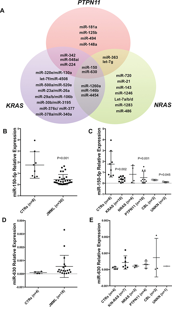 Figure 1: Deregulated microRNA Signature in JMML. A. Venn diagram showing deregulated microRNAs (miRs) in JMML patients compared to controls. MiRs belonging to either PTPN11, KRAS and NRAS are shown in detail (See also Supplementary Table 1). CBL (n=3) and unknown patients (n=4) are not included due to low numbers of samples or unknown mutation status. B. Histograms showing miR-150-5p expression in a subset of JMML patients (n=30) vs controls (n=8) as measured by qRT-PCR (P<0.001). This subset of JMML patients was choosen based on the availability of RNA after the nCounter miR profiling. C. miR-150-5p expression according to the molecular subset of JMML and controls as measured by qRT-PCR (KRAS P=0.002; PTPN11 P=0.001; UNKN P=0.045). Results are shown as relative expression. D. MiR-630 expression in a subset of JMML patients (n=30) vs controls (n=8) as measured by qRT-PCR. E. MiR-630 expression according to the molecular subset of JMML and controls as measured by qRT-PCR. Results are shown as relative. P-values were calculated on three technical replicates using Unpaired two-tailed t-test. Unreported P-values are greater than 0.05 (P>0.05).