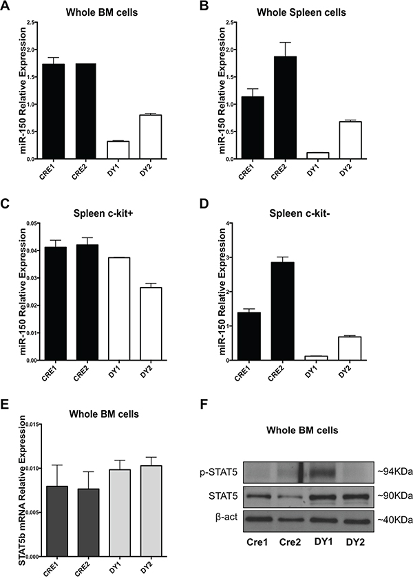Figure 3: Bone marrow and splenic cells from a Ptpn11 mutated murine model resembling JMML exhibit miR-150-5p expression downregulation and STAT5b upregulation. A. miR-150-5p expression in whole BM cells, B. unselected splenocytes and C. c-kit (CD117) positive or D. c-Kit negative selected splenocytes of Mx1-Cre; LSL-Ptpn11-D61Y (DY) mice and control mice (Mx1-Cre or CRE) as measured by qRT-PCR. Results are shown as relative expression after normalization with snoU6. E. STAT5b mRNA expression in whole BM cells from DY and CRE mice. F. Western Blotting analysis of Stat5, p-STAT5 and β-actin of whole BM cells from DY and CRE mice.