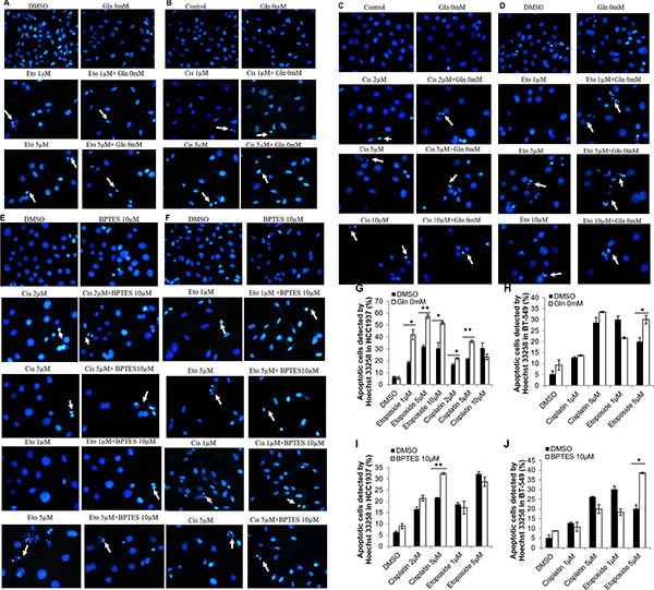 Figure 3: Morphological changes of HCC1937 and BT-549 detected by Hoechst 33258. Representative photomicrographs show cell shrinkage, condensation and fragmentation of the nuclei as well as the apoptotic bodies. Etoposide or Cisplatin, glutamine free medium and their combination produce apoptosis morphology in BT-549 cells (A, B) or HCC1937 cells (C, D). Cisplatin, etoposide, BPTES and their combination produce apoptosis morphology in HCC1937 cells (E) or BT-549 cells (F). Apoptotic cells were calculated in HCC1937 cells (G, I) and BT-549 cells (H, J). *p < 0.05, **p < 0.01. (×400).