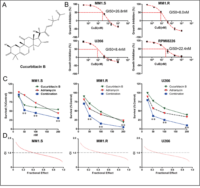 Figure 1: CuB inhibits proliferation of MM cells, acting synergistically with Adriamycin. A. Chemical structure of CuB. B. CuB reduced MM cell viability in a dose-dependent manner, with an IC50 ranging from 8 to 26.8 nM. C. Combination of CuB and Adriamycin synergistically reduced growth of MM cells. The fraction of surviving cells in each group was assessed by CCK-8 assay. Presented data are representative of three independent experiments. Statistical significance of differences was assessed by the Student t-test. ** P < 0.01. D. CuB and the Adriamycin exerted a synergistic effect on growth inhibition in MM cells. A CCK-8 assay was employed and isobologram analysis was used to determine the mode of the effects of CuB and Adriamycin combinations at equitoxic concentrations in the MM1.S, MM1.R, and U266 cells. CI, combination index, was calculated using Calcusyn software, and CI < 1.0 corresponded to a synergistic interaction.