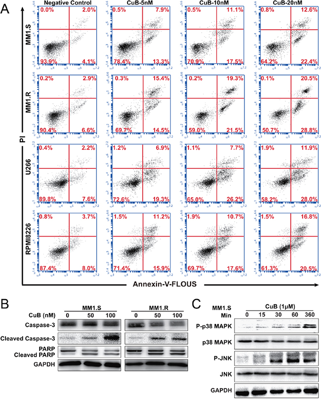Figure 2: CuB induces apoptosis in MM cells. A. MM1.S, MM1.R, U266 and RPMI8226 cells apoptosis was assessed using dual staining with Annexin V and PI. 20 nM CuB increased the fraction of apoptotic cells from 4.1% to 22.4% in MM1.S cells, 6.6% to 28.8% in MM1.R cells, 7.6% to 28.0% in U266 cells and 8.0% to 20.5% in RPMI8226 cells. B. Effects of CuB on the levels of caspase-3, PARP and their cleavage forms in the MM1.S and MM1.R cells by Western Blot. C. Effects of CuB on the levels of phospho-p38 MAPK, phospho-JNK, p38 MAPK, and JNK in the MM1.S and MM1.R cells by Western Blot.