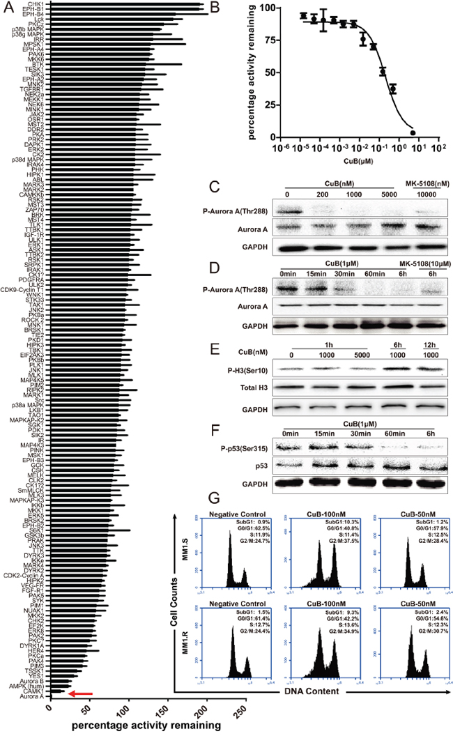 Figure 3: CuB is a novel potent Aurora A kinase inhibitor. A. The inhibitory activity of CuB was assessed against a panel of 140 protein kinases. Results presented indicate the remaining activity of each kinase (average of two duplicate determinations) in the presence of 500 nM of CuB ± standard deviation. Results are ranked according to the percentage of the remaining Aurora A treated with 500 nM CuB. Inhibition of Aurora A kinase by CuB is indicated by a red arrow. B. Aurora A kinase activity in the presence or absence of increasing concentrations of CuB. The results are presented as the percentage of kinase activity relative to the control (DMSO) and the average of at least duplicate reactions where similar results were obtained. C. CuB inhibited phosphorylation of Aurora A. D. CuB inhibited phosphorylation of Aurora A in a time-dependent manner. E. Histone H3 phosphorylation at S10 was analyzed by Western blotting. F. CuB suppressed phosphorylation of p53 in a time-dependent manner. G. Cell cycle profiles of propidium iodide-stained cells after treatment with CuB (0, 0.1 and 0.05 μM) for 24 h show a G2/M arrest.