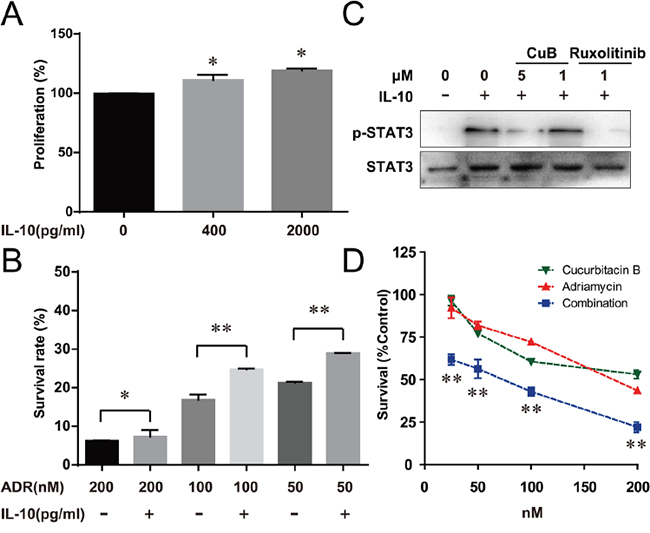 Figure 4: CuB Inhibition of the IL-10/STAT3 pathway significantly increased the cell sensitivity to Adriamycin. A. IL-10 increased proliferation of RPMI8226 cells by about 120%. B. RPMI8226 cells were pretreated with the indicated doses of Adriamycin, followed by 2000 pg/ml IL-10 for 72 h. Proliferation was assessed by CCK-8 assay. C. Serum-starved RPMI8226 cells were pretreated with the indicated doses of CuB for 30 min, then incubated with 50 ng/ml IL-10 for 10 min. At the indicated times, the cellular proteins were extracted and analyzed by Western blotting using antibodies against STAT3 and phospho-STAT3. D. Cells were treated with the indicated doses of Adriamycin alone or in combination with CuB for 72 h, and proliferation was assessed by CCK-8 assay. Statistical significance was assessed by the Student t-test, ** P < 0.01,* P < 0.05.