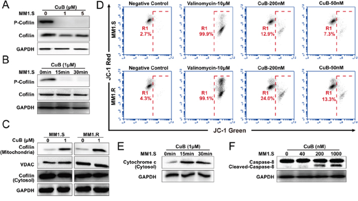 Figure 5: CuB induces dephosphorylation of cofilin, which is translocated to mitochondria, causing mitochondrial disfunction, release of cytochrome c and activation of caspase-8. A. MM1.S cells were pretreated with various concentrations of CuB (1 and 5 μM), cell lysates were analyzed by Western blot, using anti-phospho-cofilin antibodies, and both 1 and 5 μM CuB induced dephosphorylation of cofilin. B. MM1.S cells were pretreated with 1 μM of CuB at the indicated time intervals. Total cellular extracts were prepared and subjected to Western blot analysis using antibodies against phospho-cofilin. C. Cytosolic and mitochondrial fractions of control and 1 μM CuB-treated cells for 1 h were prepared and subjected to immunoprecipitation using an anti-cofilin antibody and anti-VDAC antibody, followed by immunoblotting analysis. D. The cells were treated with CuB and then stained with JC-1 probe before flow cytometry analysis. The loss of mitochondrial membrane potential was observed as a decrease in JC-1 red fluorescence (FL-2, 585 ± 40 nm) and an increase in JC-1 green fluorescence (FL-1, 530 ± 30 nm). E. The cytosolic fractions of control and cells treated with 1 μM CuB for 15 and 30 min were prepared and subjected to immunoprecipitation using an anti-cytochrome c antibody. F. The lysates of cells treated with 1 μM CuB for 6 h were prepared and subjected to immunoprecipitation using an anti-caspase-8 antibody.