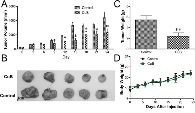 We further examined the anti-MM activity of CuB in vivo using a xenograft model of human MM in severe combined immunodeficiency (SCID) mice. As shown in Figure 6A, CuB significantly inhibited tumor growth. After 24 days, the average tumor sizes were 4410.7 ± 1754.9 mm3, and 2381.0 ± 1005.3 mm3 in the control and CuB-treated groups, respectively (Figure 6B). The average tumor weights of the control group and CuB-treated group were 5.46 ± 2.18 g and 2.14 ± 1.27 g, respectively (Figure 6C). No significant differences in body weight were observed between CuB-treated and control animals (Figure 6D), suggesting that CuB causes low host toxicity at a therapeutic dose.
