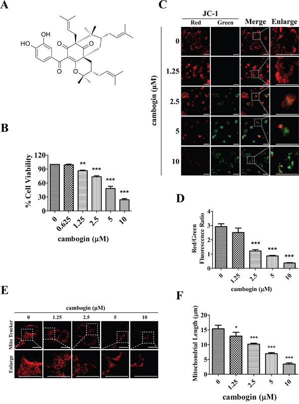 Figure 1: Cambogin inhibits cell proliferation and modulates mitochondrial network in MCF-7 cells. A. Chemical structure of cambogin. B. MCF-7 cells were treated with cambogin (0-10 μM) for 24 h. Cell viability was measured by MTT assay. C, D. MCF-7 cells were exposed to cambogin (0-10 μM) for 4 h. The percentage of cells with a reduction in ΔΨm was measured using the fluorescent dye JC-1 (10 μM). After incubation, stained cells were observed under an inverted fluorescent microscope (C) and were measured by microplate fluorescence reader (D). JC-1 dye changes color as the membrane potential increases. At higher membrane potentials, JC-1 forms aggregates, which changes the fluorescence emission color from green to red. Scale bar=100 μm. E. MCF-7 cells were treated with cambogin (0-10 μM) for 24 h. After treatment, the cells were washed, stained with MitoTracker Red for 1 h, washed again, and analyzed for mitochondrial network under confocal microscopy (×1000). Scale bar=20 μm. F. Statistical analyses of the average mitochondrial length for experiment E. Data are shown as means±SEM; *P<0.05, **P<0.01, ***P<0.001 compared with control. n=3.