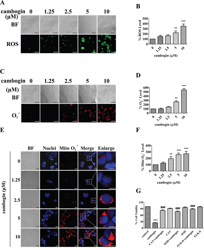 Figure 2: Cambogin induces the generation of ROS in MCF-7 cells. A, B. MCF-7 cells were treated with cambogin (0-10 μM) for 2 h. The production of H2O2 was measured using the fluorescent dye DCFH-DA (20 μM). After incubation, stained cells were observed under an inverted fluorescent microscope (A) and the fluorescence intensity units (FIU) were measured at 488 nm (excitation wavelength) and 525 nm (emission wavelength) (B). Scale bar=100 μm. C, D. MCF-7 cells were treated with cambogin (0-10 μM) for 2 h. The production of O2.- was measured using the fluorescent dye DHE (50 μM). After incubation, stained cells were observed under an inverted fluorescent microscope (C) and FIU was measured at 530 nm (excitation wavelength) and 610 nm (emission wavelength) (D). Scale bar=100 μm. E, F. MCF-7 cells were treated with cambogin (0-10 μM) for 2 h. The production of O2.- was measured using the fluorescent dye MitoSOX™ (5 μM) and Hoechst 33342 (10 μg/ml). After incubation, stained cells were observed under an inverted fluorescent microscope (E) and FIU was measured at 510 nm (excitation wavelength) and 580 nm (emission wavelength) (F). Scale bar=20 μm. G. MCF-7 cells were treated with cambogin for 24 h after pretreatment with CAT (1000 U/ml), SOD (100 U/ml), and EUK-8 (50 μM) for 2 h. Cell viability was measured by MTT assay. Data are shown as means±SEM; **P<0.01, ***P<0.001 compared with control; ###P<0.001 compared with cambogin. n=3.
