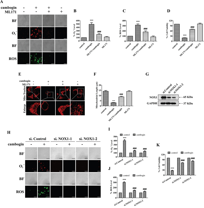 Figure 5: NOX1 is required for cambogin-stimulated generation of ROS. A. MCF-7 cells were incubated in the absence or presence of cambogin (10 μM) for 2 h after pretreatment with ML171 (20 μM) for 2 h. The production of O2.- and H2O2 were measured by DHE (for O2.-) and DCFH-DA (for H2O2) staining. After incubation, stained cells were observed under an inverted fluorescent microscope. Scale bar=100 μm. B. The FIU of O2.- was measured at 530 nm (excitation wavelength) and 610 nm (emission wavelength). C. The FIU of H2O2 was measured at 488 nm (excitation wavelength) and 525 nm (emission wavelength). D. MCF-7 cells were treated with cambogin for 24 h after pretreatment with ML171 (20 μM) for 2 h. Cell viability was measured by MTT assay. E. MCF-7 cells were treated with cambogin for 24 h after pre-treatment with ML171 (20 μM) for 2 h. The cells were then washed with HBSS by three times, stained with MitoTracker Red for 1 h, washed, and analyzed for mitochondrial network under confocal microscopy (×1000). Scale bar=20 μm. F. Statistical analyses of the average mitochondrial length for E. G. MCF-7 cells were transiently transfected with two independent NOX1 siRNAs (si.NOX1-1 and si.NOX1-2) or control scrambled siRNA (si.Control) for 48 h, NOX1 protein expression levels were determined by SDS-PAGE/Western blotting. GAPDH was served as a loading control. H. The production of O2.- and H2O2 was measured by DHE (for O2.-) and DCFH-DA (for H2O2) staining in cambogin-inhibited, NOX1-knocked down (as in G) MCF-7 cells. Scale bar=100 μm. I. The FIU of O2.- was measured at 530 nm (excitation wavelength) and 610 nm (emission wavelength). J. The FIU of H2O2 was measured at 488 nm (excitation wavelength) and 525 nm (emission wavelength). K. Cell viability was determined in cambogin-inhibited, NOX1-knocked down MCF-7 cells for 24 h. Data are shown as means±SEM; ***P<0.001 compared with control; ###P<0.001 compared with cambogin-treated cells. n=3.