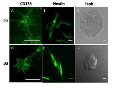 Figure 1: GBM Xenografts possess BTSCs. Immunocytochemistry demonstrating CD133 and nestin expression in EG- (A, B) and LG-BTSCs (D,E). Phase-contrast microscopy of tumorspheres (C, F). (Scale bar = 25 µm)