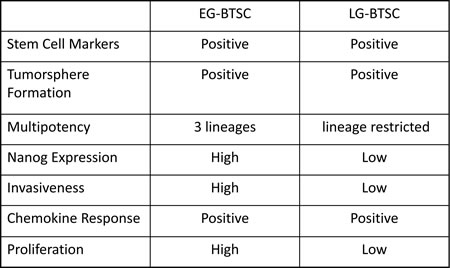 Previous studies comparing in vivo characteristics of GBM stem cells versus non-stem cells have shown that the former have a significantly increased tumorigenic capacity, and consequently result in shorter survival times of implanted mice [11, 54-56]. Our finding that differentiating the multipotent EG-BTSCs correlated with decreased tumorigenicity and increased survival is consistent with these previous reports. Moreover, our result that inducing differentiation of the lineage restricted LG-BTSC, which caused no decrease in tumorigenicity or survival, may be attributable to an inability of the LG-BTSCs to differentiate.