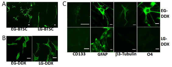 Figure 2: EG-BTSCs are multipotent. (A) Fluorescent phalloidin staining demonstrating differences in morphology between EG- and LG-BTSCs (green). EG-BTSCs are multipolar and astrocytic, whereas LG-BTSCs are bipolar and fibroblastic. (B) Both EG differentiated (EG-DDX) cells and LG differentiated (LG-DDX) cells stained with phalloidin demonstrate changes in morphology with differentiation. (C) Immunofluorescence analysis of CD133 and lineage marker expression in EG- and LG-DDX cells. Both EG and LG-DDX cells lose CD133 expression and express the astrocytic marker GFAP (green). Only EG-DDX cells upregulate β3-tubulin (neuronal) and O4 (oligodendrocytic) (green). Scale bar = 25 µm.