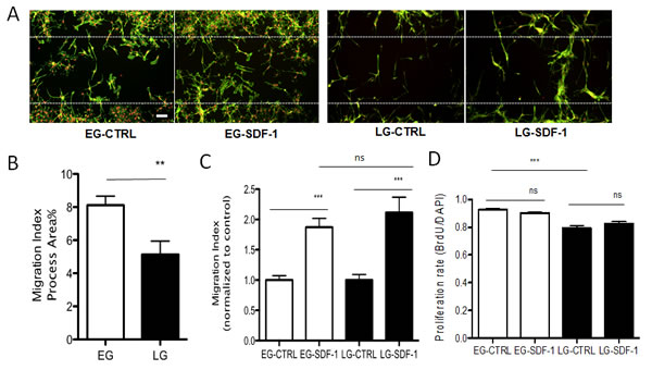 Figure 3: EG-BTSCs are more migratory and proliferative than LG-BTSCs. (A) Immunostaining of gap migration assay (phalloidin=green; DAPI=red) and (B) quantitative analysis showing BTSC invasive migration into the gap (white dashed line indicates boundary of gap). EG-BTSCs demonstrate increased invasive migration compared to LG-BTSCs. Migration index was 8.1% for EG-BTSCs, and 5.1% for LG-BTSCs. (C) EG- and LG-BTSCs have a similar magnitude response to chemotrophic signaling. Migration index of SDF-1 treated stem cells filling in the gap, as normalized to control, was 1.9 for EG-BTSCs, and 2.1 for LG-BTSCs. (D) BrdU labeling demonstrating EG-BTSCs are more proliferative than LG-BTSCs (0.93 vs. 0.79, respectively). Treatment with SDF-1 had no effect on the proliferation rate of either population. (**=p< 0.01; ***=p< 0.001; data from at least 3 independent experiments). Scale bar = 100 µm).