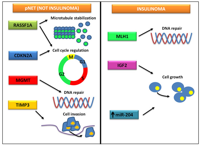 Figure 2: Frequent epigenetic modifications in insulinomas and other pNETs. While the epigenetic landscape of insulinomas is characterized by alterations of the signaling of MLH1 and IGF2, non-insulinoma pNETs are defined by a different pattern of epigenetic changes, eventually leading to cell cycle dysregulation, increased cell motility and chemoresistance.