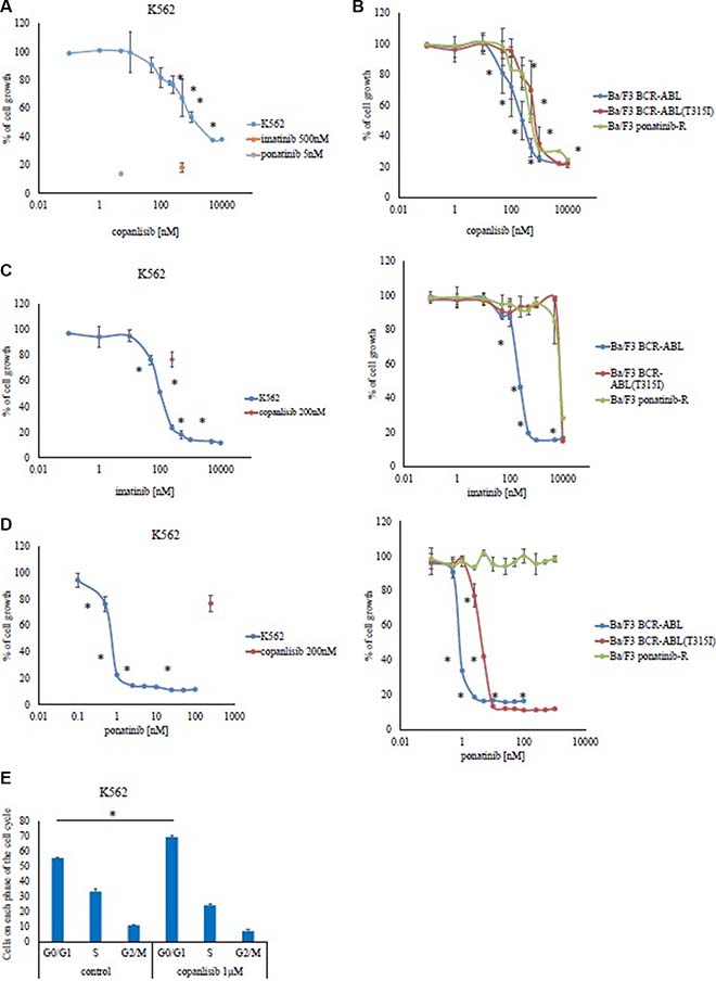 Figure 1: Effects of copanlisib and ABL TKI on BCR-ABL-positive cells. K562 (A), as well as Ba/F3 BCR-ABL cells, Ba/F3 BCR-ABL (T315I) mutant cells, and Ba/F3 ponatinib-R cells (B) were treated with the indicated concentrations of copanlisib for 72 h, after which their relative growth rates was determined. *P < 0.05 compared with the control. K562, Ba/F3 BCR-ABL, Ba/F3 BCR-ABL (T315I) mutant cells, and Ba/F3 ponatinib-R cells were treated with the indicated concentrations of imatinib (C) or ponatinib (D) for 72 h, and their relative growth rates were determined. *P < 0.05 compared with the control. (E) A cell cycle analysis was performed as described in the Materials and Methods. The results (A–E) shown are representative of three independent experiments.