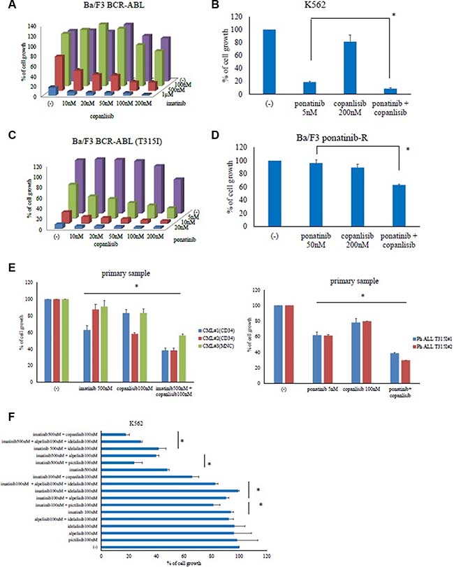 Figure 2: Co-treatment with copanlisib and ABL tyrosine kinase inhibitors decreased the proliferation of BCR-ABL-positive leukemia cells. Ba/F3 BCR-ABL, K562, Ba/F3 BCR-ABL (T315I) mutant, and Ba/F3 ponatinib-R cells were treated with the indicated concentrations of copanlisib, imatinib (A), both, or ponatinib (B–D) for 72 h. The relative cell growth rates were determined. *P < 0.05 compared with ponatinib treatment. (E) CD34-positive CML cells, Ph-positive ALL T315I cells or CML mononuclear cells were treated with copanlisib, imatinib, both copanlisib and imatinib, or ponatinib for 72 h. The relative cell growth rates were determined. *P < 0.05, compared with the control cells. (F) K562 cells were treated with (i) imatinib and/or pictilisib, (ii) alpelisib, idelalisib, and imatinib, or (iii) with alpelisib and idelalisib for 72 h, after which the relative cell growth rates were determined. The data shown represent three independent sets of experiments. *P < 0.05, compared with alpelisib or idelalisib or pictilisib treatment alone. These experiments were performed in triplicate.