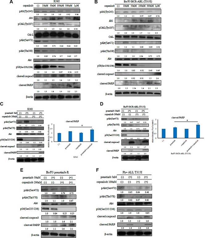 Figure 3: Effects of copanlisib and ABL TKIs on BCR-ABL-positive leukemia cells. K562 (A) and Ba/F3 BCR-ABL (T315I) mutant cells (B) were treated with copanlisib at the indicated concentrations for 24 h. The total extracts were examined by an immunoblot analysis with Abs against phospho ABL (Tyr 245), phospho-Crk-L (Tyr207), phospho-Akt (Ser473), phospho-S6 ribosomal protein (Ser235/236), cleaved PARP, cleaved caspase 3, ABL, Crk-L, and β-actin. K562 cells (C), Ba/F3 BCR-ABL (T315I) mutant cells (D), Ba/F3 ponatinib-R cells (E), and primary cells (F) were treated with copanlisib and/or ponatinib at the indicated concentrations for 24 h. Cleaved PARP was quantified using ImageJ. *P < 0.05 compared with imatinib or ponatinib treatment. These experiments were performed in triplicate.