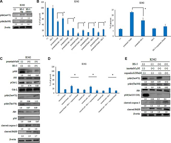 Figure 4: Analysis of ABL tyrosine kinase inhibitor activity in the presence of HS-5 feeder cells. (A) K562 cells were treated with or without HS-5 cell culture supernatant and co-cultured with HS-5 cells for 24 h. Phosphorylation of Akt (Ser473 and Thr308) was examined by an immunoblot analysis. Actin was detected as a loading control. (B) K562 cells were co-cultured with or without HS-5 cells and treated with the indicated concentrations of ponatinib for 48 or 72 h, and the relative cell growth rates and percent of apoptotic cells were determined. *P < 0.05 compared with the control cells. The results shown represent three independent experiments. (C) K562 cells were co-cultured with or without HS-5 feeder cells and treated with ponatinib at the indicated concentration for 24 h. Total extracts were examined by an immunoblot analysis with Abs against phospho ABL (Tyr245), phospho-Crk-L (Tyr207), phospho-S6 ribosomal protein (Ser235/236), cleaved caspase 3, cleaved poly-ADP-ribose polymerase, ABL, Crk-L, and β-actin. (D, E) K562 cells were treated with copanlisib and imatinib in the presence of HS-5 feeder cells for 72 h, the relative cell growth rates were determined, and lysates were examined by an immunoblot analysis with Abs against phospho-Akt (Ser473, Thr308), phospho-S6 ribosomal protein (Ser235/236), cleaved PARP, cleaved caspase 3, and β-actin. These experiments were performed in triplicate.