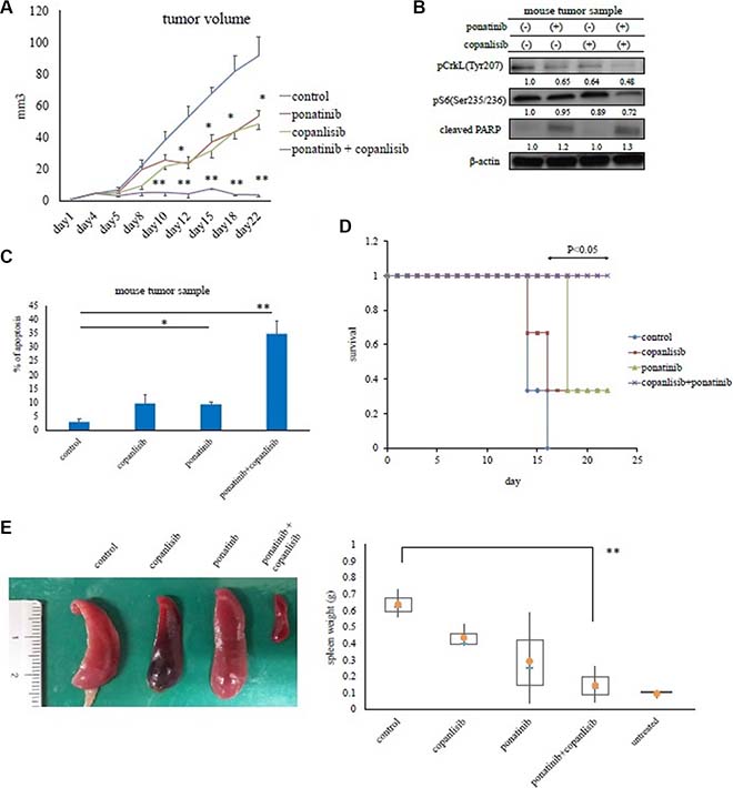 Figure 5: Effects of copanlisib and ponatinib on Ba/F3 T315I cell proliferation in a mouse model. (A) In vivo studies were performed as described in the Materials and Methods. Tumor volumes were evaluated every three days. *P < 0.05 and **P < 0.01 compared with the control group (n = 4 mice/group). (B) Tumor samples from xenograft models treated with or without ponatinib and copanlisib were examined by an immunoblot analysis. (C) Tumor cells treated with or without copanlisib and ponatinib for 24 days were analyzed immunohistochemically via hematoxylin and eosin staining, or with an Ab against cleaved caspase 3, as described in the Materials and Methods. Cleaved caspase 3-positive cells in paraffin-embedded tissue sections of transplanted subcutaneous tumors were counted. *P < 0.05, **P < 0.01. (D) Kaplan–Meier survival curves for ponatinib- and/or copanlisib-treated Ba/F3 BCR-ABL (T315I) mutant cell intravenously injected mice (n = 3 mice/group). *P < 0.05 compared with control mice. (E) Total spleen volumes for intravenously injected and untreated control mice which did not receive transplanted Ba/F3 BCR-ABL (T315I) mutant cells. The image of the spleen is representative from each group of mice. All data are shown as the mean ± standard error of the mean from. **P < 0.01 compared with the control mice. The results shown in panels A–E are representative of at least two complete experiments.