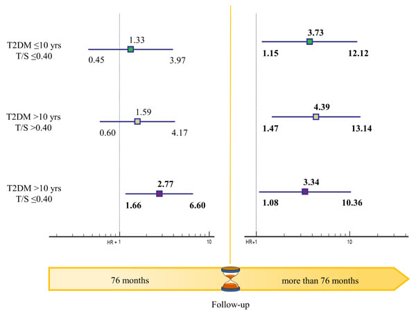 The time-varying risk of mortality was obtained by calculating the month when half of the patients had died (76th month) and splitting the follow-up into the time up to 76 months and the remaining period. In the first 76 months, the mortality risk of patients with T2DM duration > 10 years and T/S ≤ 0.40 was increased compared with the reference group (HR = 2.77, 95% CI: 1.66-6.60, p < 0.05). In the remaining months the mortality risk compared with the reference group was increased in all the other groups (Figure 3).