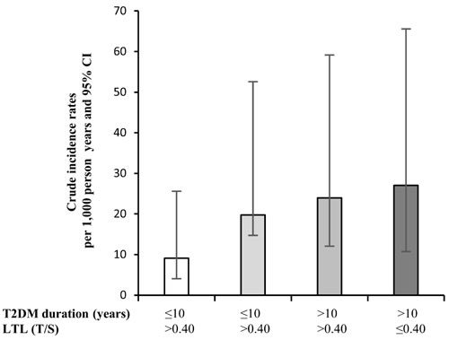 Figure 4: Crude incidence mortality rates per 1,000 person years in T2DM patients grouped by LTL and disease duration. LTL: Leukocyte telomere length; T⁄S: telomere-to-single copy gene ratio.