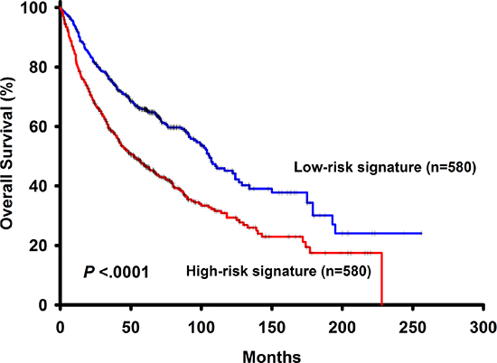 To further validate our findings, the risk score derived from 6 genes associated with overall survival was applied directly to merged public datasets including GSE50081, GSE30219, GSE31210, GSE19188, GSE37745, GSE3141 and GSE31908 GSE3141. The basic characteristics of the validation cohort were shown in Supplementary Table 1. In this dataset, result of the survival analysis showed that patients with high risk signature had shorter overall survival (p < 0.0001) (Figure 3). In univariate Cox model, the 6-gene risk signature was a risk factor of patients’ survival (HR = 1.74, 95% CI: 1.47–2.05, p < 0.0001). In multivariate Cox model, the 6-gene risk signature (adjusted HR = 1.50, 95% CI: 1.25–1.80, p < 0.0001), histology (adjusted HR = 0.65, 95% CI: 0.54–0.78, p < 0.0001) and gender (adjusted HR = 1.43, 95% CI: 1.17–1.74, p = 0.0005) are independent prognostic factors. Overall, the risk score, based on a linear combination of the expression level of 6 genes, which classified patients into high or low risk signature, is consistently an independent prognostic factor associated with NSCLC patient survivals.