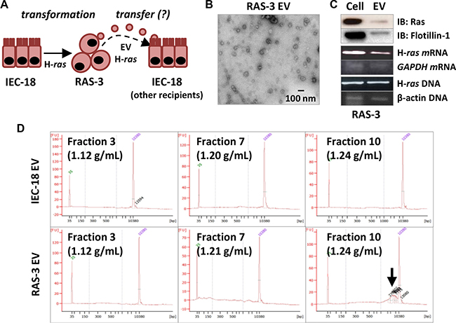 Figure 1: Mutant H-ras-mediated cellular transformation stimulates EV-mediated emission of the H-ras oncogene and extracellular genomic DNA. (A) Experimental model: rat epithelial cells (IEC-18) give rise to their transformed clone (RAS- 3) following transformation with human oncogenic H-ras. RAS-3 cells emit H-ras-containing EVs, which are hypothesized to transfer oncogenic cargo to non-transformed recipient cells, including IEC-18. (B) RAS-3 cells emit exosome-like EVs (TEM at 30K magnification). (C) RAS-3-derived EVs contain HRAS protein, mRNA and human oncogenic H-ras DNA sequences. (D) Bioanalyzer QC plots of EV preparations from IEC-18 and RAS-3 cells, resolved on the continuous sucrose gradient. Notable the emission of gDNA in the exosomal fraction 10 (Arrow) of RAS-3-derived EVs.