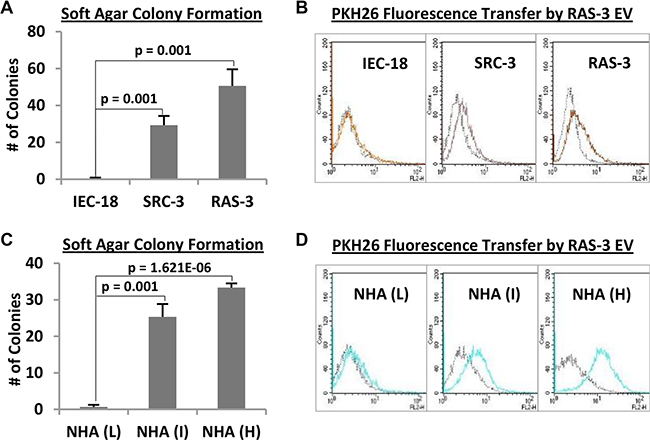 Figure 2: Cellular transformation overcomes resistance of immortalized epithelial cells and astrocytes to the uptake of H-ras-containing EVs. (A) The non-transformed phenotype of IEC-18 cells is revealed by their inability to form colonies in soft agar, a property that contrasts with a robust transformation of their derivatives harboring v-src (SRC-3) or H-ras (RAS-3) oncogenes. (B) IEC-18 cells are unable to efficiently take up PKH26-labelled EVs from RAS-3 cells, while their transformed SRC-3 and RAS-3 variants exhibit robust EV uptake (FACS – PKH26). (C) Normal human astrocytes (NHA) undergo spontaneous transformation in serial culture, through low (L), intermediate (I) and high (H) passage numbers, a change revealed by their rising soft agar colony formation ability. (D) Transformation of NHA cells is coupled with the increase in their ability to take up EVs produced by PKH26-labelled RAS-3 cells (FACS – PKH26). Data are presented as the means ± SD and are representative of three independent experiments. P-values as indicated.