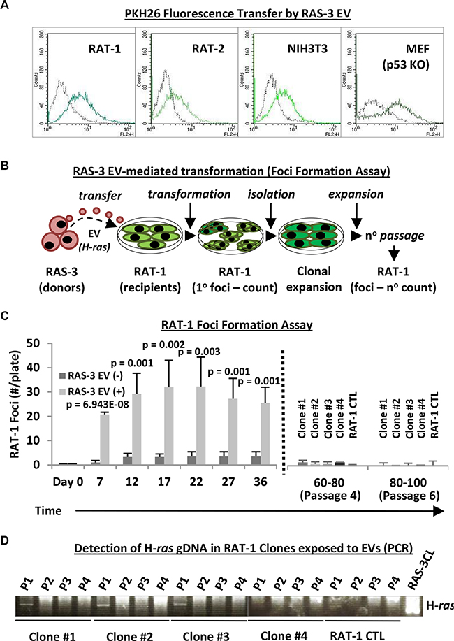 Figure 3: Uptake of mutant H-ras-containing EVs by fibroblastic cell lines leads to transient transformation and temporary retention of the exogenous DNA. (A) Fibroblastic cells, such as RAT-1, RAT-2, NIH3T3 and MEFp53−/− (MEF p53KO), readily take up RAS-3-derived EVs (FACS – PKH26). (B) Experimental design for testing transforming potential of RAS-3-derived EVs containing mutant H-ras against RAT-1 recipient cells. (C) Time-dependent foci formation by RAT-1 fibroblasts in the presence or absence of RAS-3-derived EVs. After 36 days, the remaining foci were individually re-plated (dotted line), and the cells expanded and passaged 6 times (80–100 days), resulting in gradual disappearance of their foci-forming ability. (D) The transient retention of exogenous H-ras gDNA by EV recipient, RAT- 1 foci-forming cells. The human-specific PCR signal is only observed at passage 1 (P1) post-isolation and later lost in subsequent passages (P2-P4). Data are represented as the means ± SD and are representative of four independent experiments. P-values as indicated.