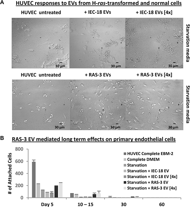Figure 4: Uptake of mutant H-ras-containing EVs by primary endothelial cells leads to a transient growth/survival stimulation in the absence of long-term transformation. (A) HUVECs require angiogenic factors and serum for long-term survival, which is compromised under growth factor and nutrient starvation conditions (Starvation Media). In this setting, HUVECs lose morphological integrity and viability within 5 days. Addition of purified EVs from RAS-3 cultured cells, which are angiogenic and harbor mutant H-ras oncogene, partially reverses this process, while EVs from parental IEC-18 cells lack this activity. Images were taken within 5 days at 200x magnification. (B) Transient responses of HUVEC to oncogenic EVs. The adherent HUVECs were counted in the presence of complete or starvation medium, and the effects of RAS-3-derived EVs (containing H-ras) were compared to those of IEC-18-derived EVs. The pro-survival effects of EVs were weaker than those of recombinant growth factors and eventually lost, resulting in no evidence of transformed cells. Data are represented as the means ± SD and are representative of two independent experiments.