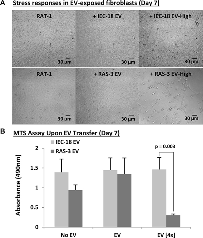 Figure 5: Elevated concentrations of H-ras-containing EVs compromise the survival of recipient fibroblasts. (A) Morphological evidence (phase contrast microscopy) of cellular stress and death (detachment) of RAT-1 fibroblasts exposed for 7 days to concentrated (4×) EVs purified from RAS-3 conditioned medium. No such effect accompanied lower EV concentrations or concentrated EVs from non-tumorigenic IEC-18 cells. Images were taken on day 7 at 200x magnification. (B) MTS measurements of changes in metabolic activity of RAT-1 cells following treatment with indicated preparations suggest toxic effects of H-ras-containing EVs. Data are presented as the means ± SD and are representative of three independent experiments P-values as indicated.